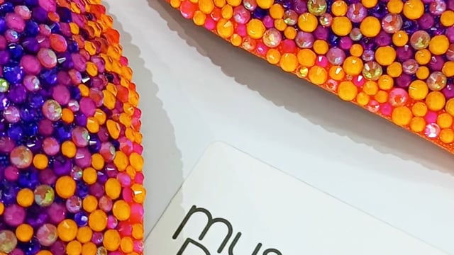 This exciting Violet Flame Competition Bikini is decorated with neon orange, neon hyacinth, neon pink, violet and blue-purple crystals on a purple fabric.