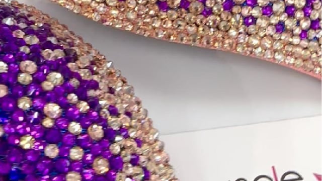 This captivating violet royale competition bikini is brilliantly decorated with luminous champagne, peach, purple, blue and dark blue crystals on a deep blue fabric.