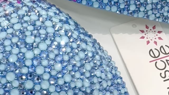 This luxurious Violet Sapphire Competition Bikini is crystalled with a gorgeous mix of light blue, neon light blue, neon berry, neon purple and violet crystals on light blue fabric.
