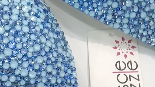 This Violet Sapphire Figure Suit is decorated with a beautiful blend of light blue, neon light blue, neon berry, neon purple and violet crystals on a light blue fabric.