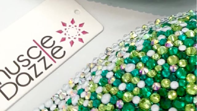 Dazzle the judges in this fabulous emerald wellness suit featuring a array of crystal ab and 3 different shades of green rhinestones on emerald fabric.