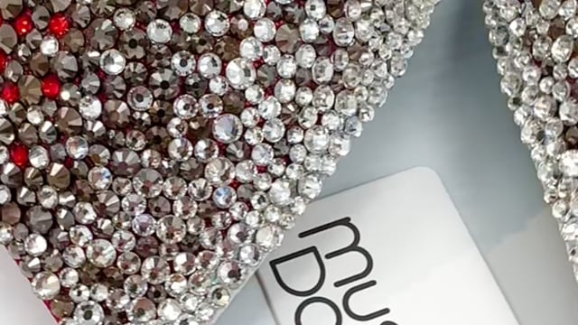 This captivating Scarlet Frost Wellness Suit is decorated with a stunning blend of crystal, dark silver, light and dark red crystals on red fabric.