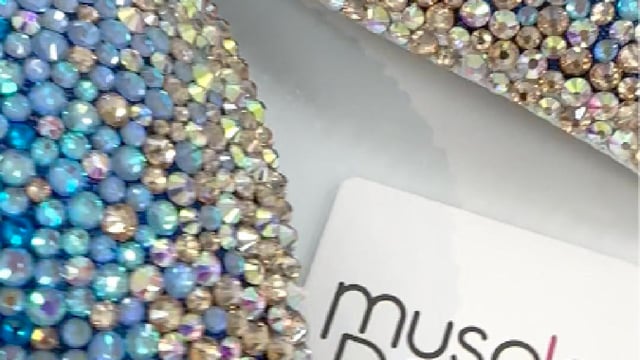 This fabulous Starlight Sapphire Wellness Suit is decorated with shimmering crystal AB, gold shadow, neon sapphire, sapphire and mid-blue crystals on a pretty blue fabric.